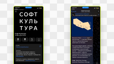 Telegram-канал @softculture образовательной платформы "Софт Культура" для архитекторов и дизайнеров с курсами по софту и разборами портфолио.
