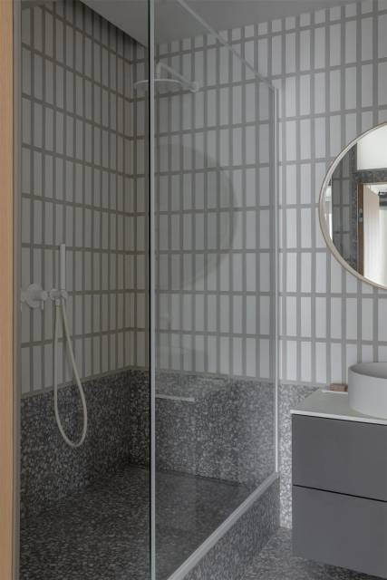 В планировке мы объединили кухню и гостиную, отказались от прихожей и добавили остров. Пилон между комнатами превратили в акцент: закруглили, облицевали плиткой и сделали главным элементом пространства.
