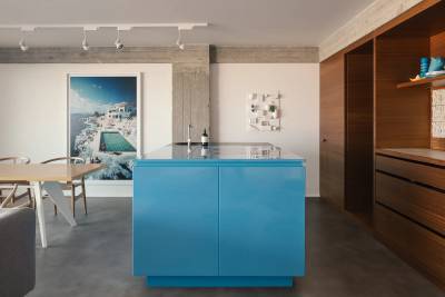 Кухня, в проекте бельгийской студии contekst, выполнена из комбинации стали и темно-серого бетона — это решение зонирует пространство. Бетонная зона, отлитая на месте, предназначена для раковины и посудомоечной машины, а зона из голубой стали — для готовки и хранения.