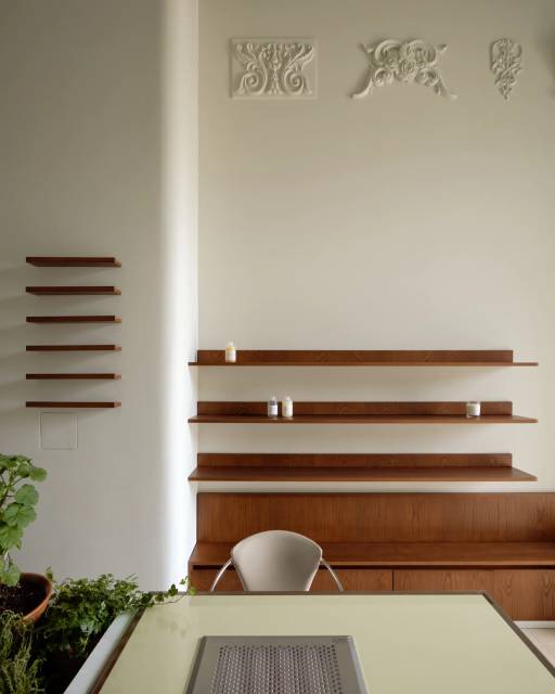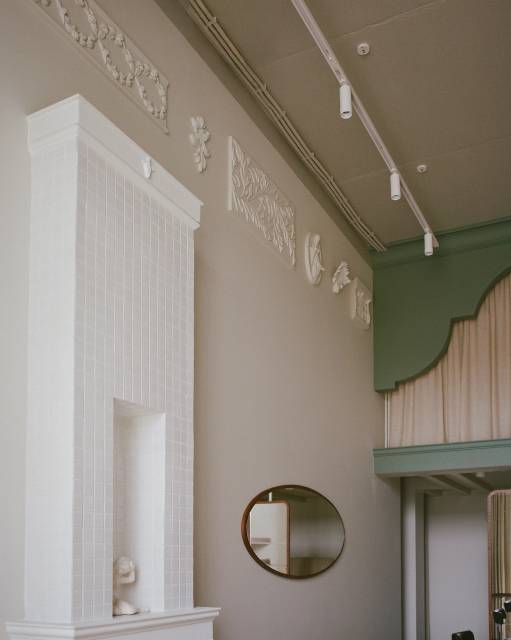 Визуально мы пришли к соединению модернистского языка и фигуративных, уютных элементов и материалов. Интерьер работает с темой дома, развивая ее не напрямую, а за счет определенных знаков и нюансов. Камин — "якорь дома" — служит декорацией и скульптурой одновременно. Занавес второго этажа напоминает задернутые шторы. Лепные элементы на стенах, размещенные как будто в произвольном порядке, отсылают к домашним коллекциям античных слепков.
