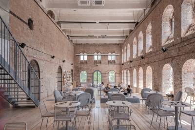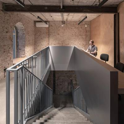 К моменту начала работы в пространстве сохранилось минимальное количество декора. Однако в основе концепции лежит максимальное уважение к подлинному: все вмешательства выполнены в подчеркнуто современном стиле, контрастируя с голой кирпичной кладкой старинных стен и оригинальными деталями, и являются исключительно функционально обоснованными.