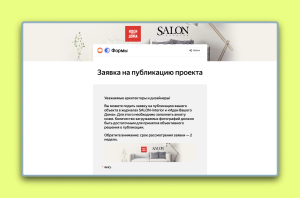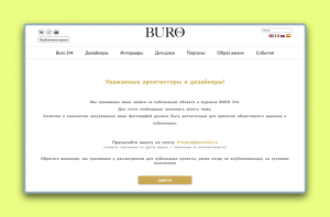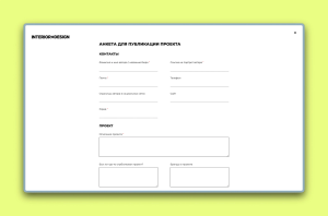 Где анкета и как подавать: Кнопка «Опубликовать проект» в меню сайта. Форма работает только в десктопной версии. Анкета запрашивает: имя автора или название бюро, портрет автора, email, телефон, соцсети, сайт, город, описание проекта, информацию о предыдущих публикациях, бренды в проекте, ссылку на фото, локацию, площадь, год реализации, имя фотографа и стилиста.