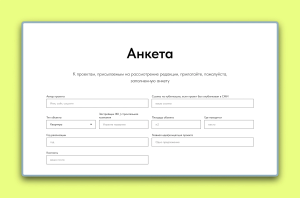 Где анкета и как подавать: Форма на отдельном поддомене. Анкета запрашивает: ФИО, телефон, email, категорию объекта, площадь, местоположение, название ЖК или серию дома, сроки работ, имя фотографа, ссылку на фото, описание объекта, ссылки на соцсети.